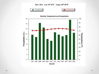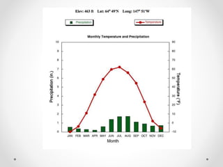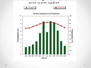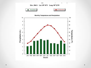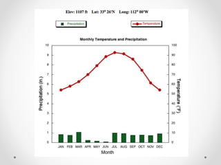 Climographs are graphs that show monthly temperature and precipitation averages over many years to depict a region's climate patterns. They display average monthly temperature and precipitation data to illustrate climate norms and extremes. Climographs are used by climatologists and others to analyze climate trends and variations.