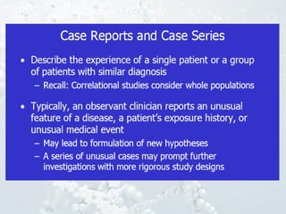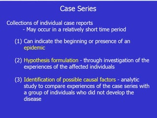 1. The document discusses various types of clinical research studies including observational studies like case reports, cross-sectional studies, and analytical studies like case-control and cohort studies.