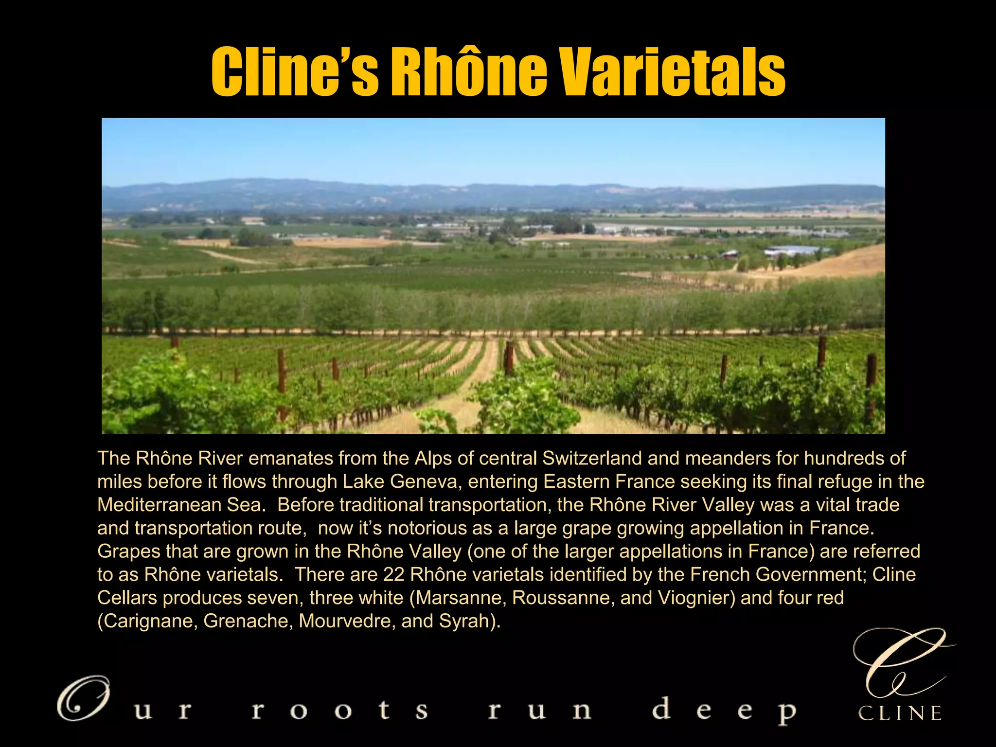This document summarizes Cline Vineyards' production of seven Rhône varietals - Marsanne, Roussanne, Viognier, Carignane, Grenache, Mourvèdre, and Syrah. It provides details on the characteristics and terroir of each grape variety and describes how Cline grows and produces wines from these varietals, highlighting old vine blocks that produce concentrated, complex wines.