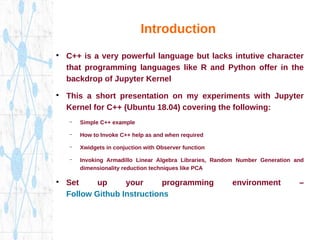 This document summarizes experiments with the Jupyter Kernel for C++. It covers creating a simple C++ program in Jupyter, invoking C++ help, using Xwidgets with observer functions, and invoking the Armadillo linear algebra library for tasks like principal component analysis. The goal is to demonstrate how Jupyter can provide an intuitive interface for C++ similar to languages like Python and R. Setup instructions are provided to replicate the environment.