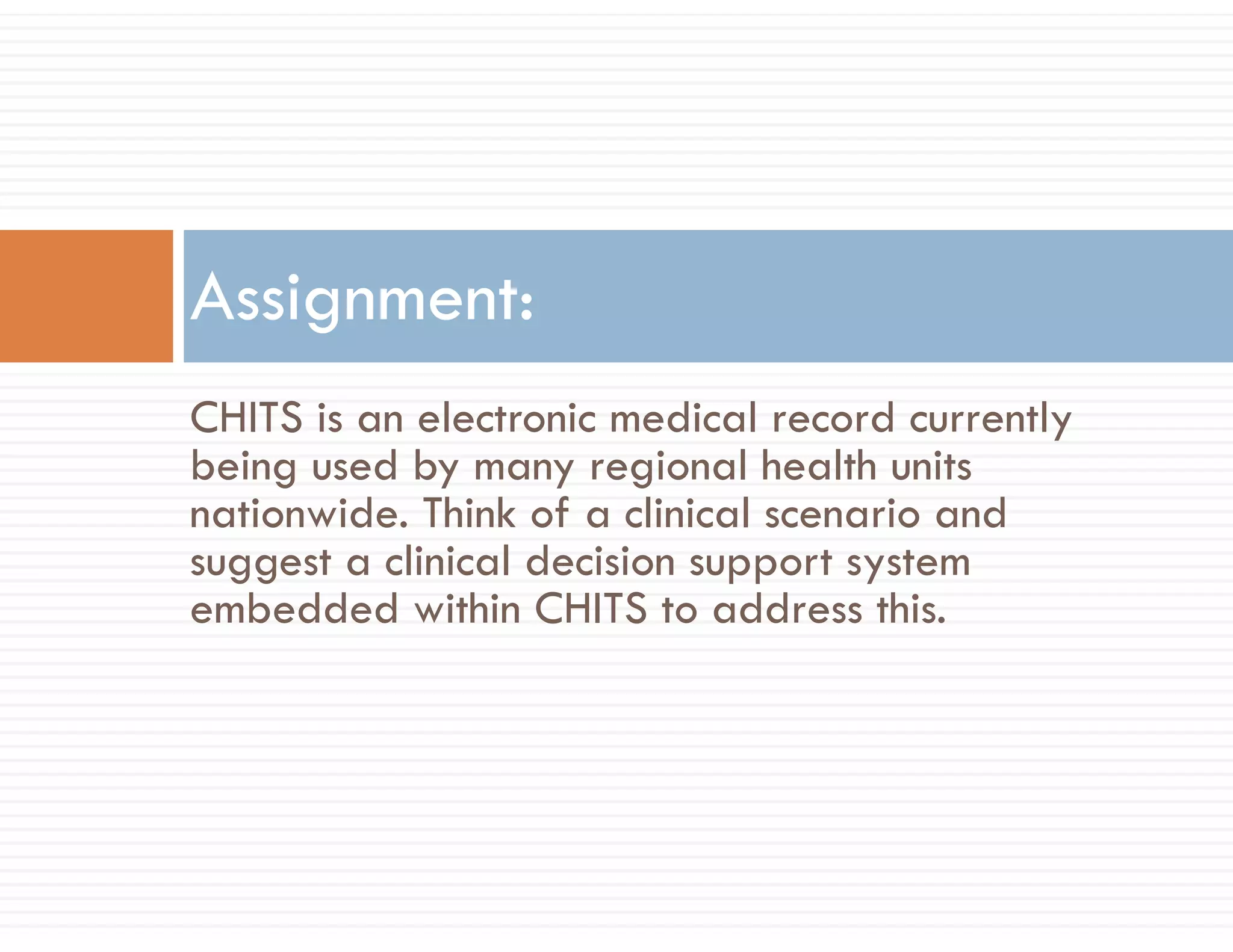 The document describes a proposed clinical decision support system to be embedded within the existing electronic medical record system CHITS. The system would help physicians diagnose and treat patients. It allows recording patient information, analyzing cases by entering symptoms, displaying likely diseases, providing evidence about diseases, and recommending treatments including tests, medications, and scheduling follow ups. Warnings would alert about dosage errors. The system aims to make patient visits and diagnoses more efficient.