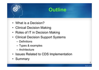 Clinical decision support systems use information technology to reduce errors and improve clinical decision making by providing clinicians with patient data, knowledge resources, and clinical guidance at the point of care through tools such as diagnostic decision trees, drug databases, alerts, and reminders. However, implementing clinical decision support systems poses challenges around usability, workflow integration, and clarifying the relationship between machine recommendations and human clinical judgment.
