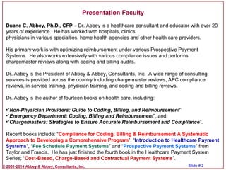 This document outlines a presentation on clinical documentation improvement for physician E/M coding. The presentation will cover understanding the range of E/M codes with an emphasis on code sequences, E/M coding requirements from CPT, typical encounters for different code levels, issues like new vs. established patients, coding by time requirements, the importance of the chief complaint, undercoding and overcoding risks, CMS documentation guidelines, the role of medical decision making, examination templates, overall templates for E/M services, and who can perform different parts of the E/M service. The presenter, Duane C. Abbey, is an experienced healthcare consultant and educator who will review these topics to help optimize reimbursement under prospective payment systems.