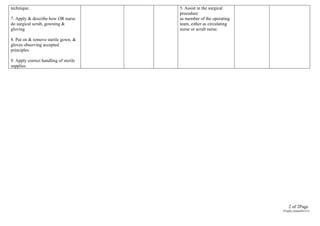 The document outlines the clinical objectives for nursing students in a surgical setting, specifically focusing on competencies such as sterile techniques, surgical scrubbing, and the roles of operating room team members. Students are expected to demonstrate their skills in these areas over a two-week clinical placement. Evaluation will be based on students' effectiveness and efficiency in assisting with surgical procedures.