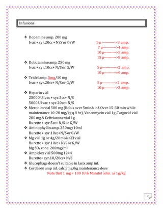 1) Infusion guidelines for various drugs like dopamine, dobutamine, heparin etc with recommended doses and diluents.
