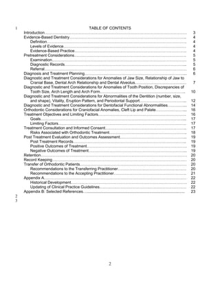This document provides clinical practice guidelines for orthodontics and dentofacial orthopedics. It discusses evidence-based dentistry and levels of evidence. It outlines considerations for pretreatment examinations, diagnostic records, referrals, and diagnosis/treatment planning. It describes diagnostic and treatment considerations for various anomalies including jaw size, tooth position, arch form, and dentition. It addresses treatment objectives/limiting factors, risks, outcomes assessment, retention, and record keeping including transferring patients between practitioners.