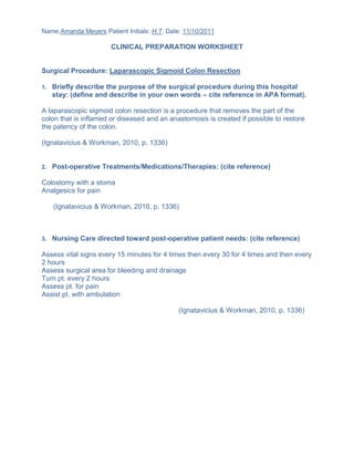 Sigmoid diverticulitis occurs when pouches form in the sigmoid colon wall and become inflamed. Symptoms include abdominal pain, fever, nausea, and bleeding. Diagnostic tests include CT scans, barium enemas, and colonoscopies. Treatment involves antibiotics, fluids, pain medication, and sometimes surgery to remove the inflamed portion of the colon. For patients undergoing laparoscopic sigmoid colon resection, the procedure removes the diseased part of the colon and reattaches the healthy parts. Post-operative care focuses on pain management, monitoring the surgical site, and early ambulation.