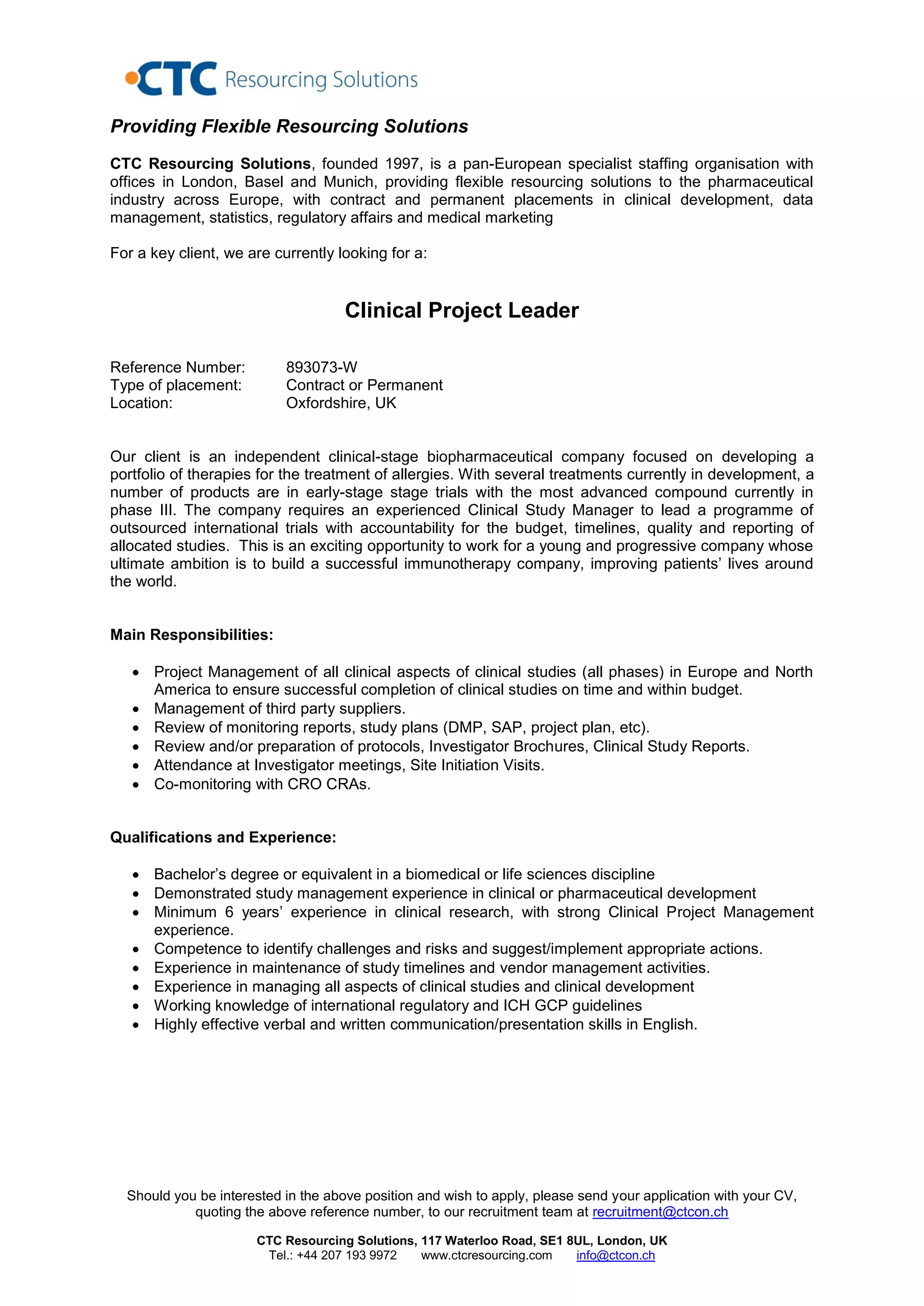 This document is a job posting for a Clinical Project Leader position at a biopharmaceutical company focused on developing therapies for allergies. The posting provides details on the responsibilities, which include project management of clinical studies in Europe and North America to ensure on-time and on-budget completion, as well as management of third party suppliers and study documents. Qualifications sought include a life sciences degree, minimum 6 years of clinical research experience including strong project management skills, and knowledge of international regulations and good clinical practices.