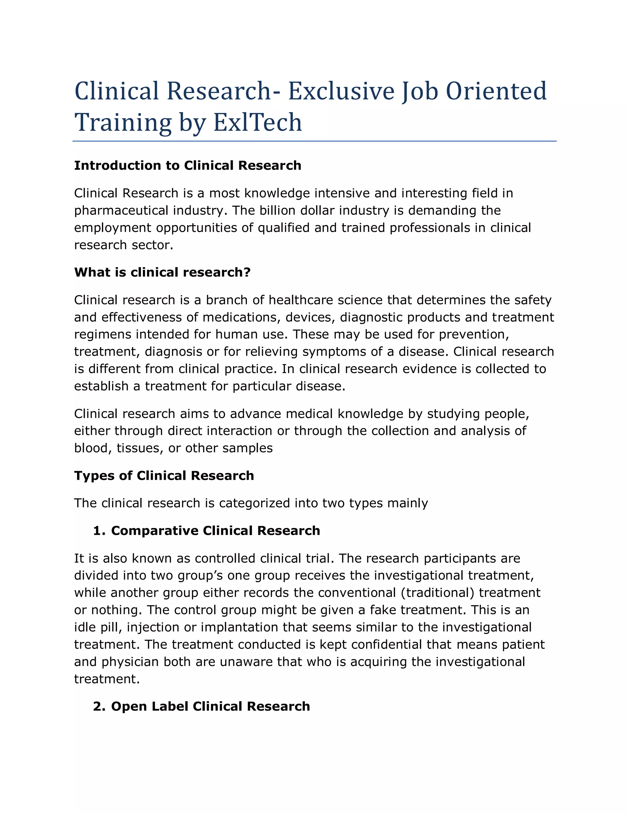 The document discusses clinical research, a critical field in the pharmaceutical industry that evaluates the safety and effectiveness of treatments. It outlines the types of clinical research, phases of trials, and career opportunities in India, emphasizing the growing demand for trained professionals. Exltech is highlighted as a notable training institute in Pune, offering job-oriented courses in clinical research.