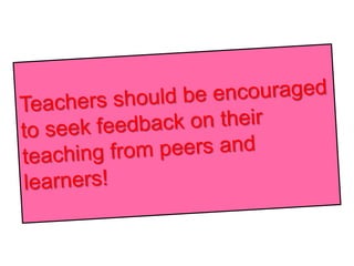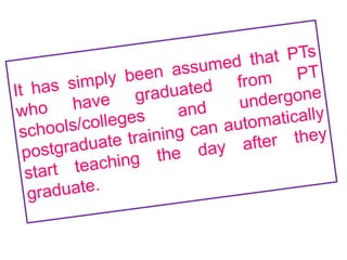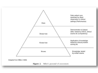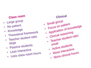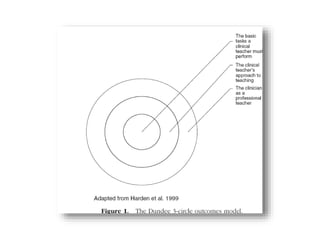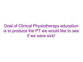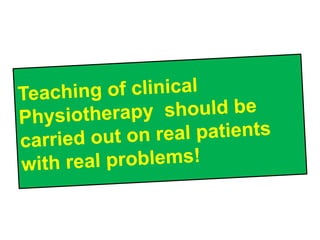 This document discusses clinical physiotherapy education and teaching. It outlines the goal of clinical physiotherapy education as producing physiotherapists that teachers would want if they were sick patients. It describes the clinical environment, focus on patients, problem diagnosis and management. It also discusses challenges of clinical teaching like time constraints and engaging multiple levels of learners. Skills of excellent clinical teachers are outlined as well as challenges of inpatient and outpatient teaching. Different learning styles, clinical teaching models, problems and dos/don'ts of clinical teaching are also summarized.