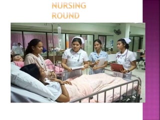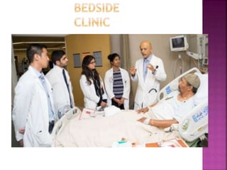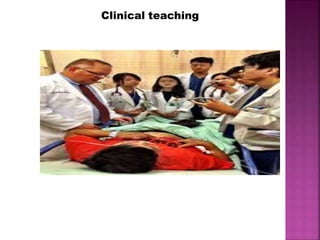 This document discusses clinical teaching in nursing education. It defines clinical teaching as individualized or group teaching of nursing students in clinical settings by nurse educators, staff, and managers. The goals of clinical teaching are to help students develop skills like critical thinking, communication, and technical proficiency so they can provide holistic, patient-centered care. Clinical teaching provides opportunities for students to apply theoretical knowledge at the bedside through methods like bedside clinics, nursing rounds, and demonstrations. This allows students to bridge the gap between theory and real-world nursing practice.