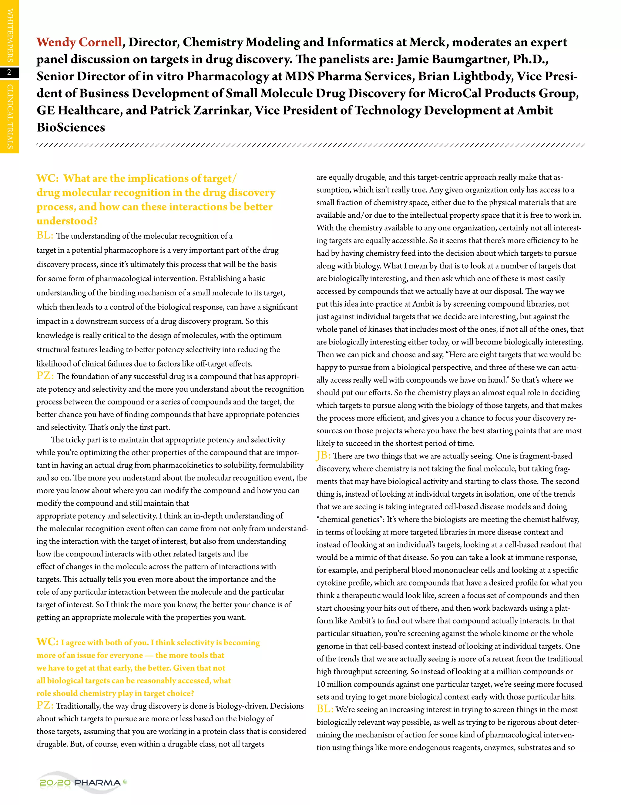 The discussion highlights the critical role of chemistry in drug discovery, particularly in targeting and optimizing molecules for better potency and selectivity. Panelists emphasize the importance of understanding molecular recognition and biological context, advocating for integrated approaches that consider multiple targets and use biophysical methods to improve prediction of drug-like properties. A focus on well-characterized hits and early evaluation of compounds leads to more informed decisions, enhancing the likelihood of success in drug development.
