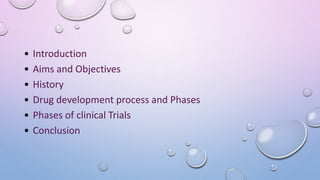 Clinical trials involve research studies that assign participants to medical interventions to evaluate their effects. There are various phases of clinical trials. Phase 0 involves micro-dosing to determine pharmacokinetics. Phase I tests safety on healthy volunteers. Phase II evaluates dosing and efficacy on patients. Phase III tests larger groups to confirm efficacy and monitor safety compared to standard treatments. Phase IV occurs after approval to further monitor long-term safety and efficacy. The document outlines the goals and timeline of each phase in the drug development and approval process.
