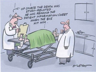 This document discusses the clinical trials process from protocol development through study completion. It covers developing the protocol, regulatory documents, patient recruitment, safety reporting, interim reports, and end of study activities. Key aspects include writing an approvable protocol, establishing an investigator site file, screening and enrolling suitable patients, maintaining safety oversight, and conducting closeout procedures. The goal is to provide guidance on managing all stages of a clinical trial.