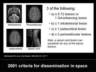 #8 The criteria were further revised in 2010 to allow for an earlier MS diagnosis.[3] In the McDonald 2010 revision, lesion dissemination in space can be confirmed with just one T2 lesion in at least 2 of 4 characteristic locations: juxtacortical, periventricular, posterior fossa, and in the spinal cord.