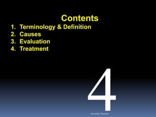 The document discusses abnormal-looking cervix (suspicious cervix). It defines the condition and lists potential causes such as infections, hormonal/nutritional factors, and neoplasms. Evaluation involves history, exam, tests for infections, cytology, colposcopy. Treatment depends on underlying cause but may include procedures like cryotherapy for pre-cancerous lesions. Screening programs in developing countries commonly use visual inspection with acetic acid followed by cryotherapy for pre-cancerous lesions detected.