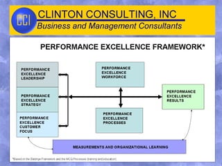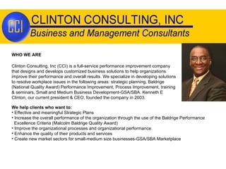 Clinton Consulting is a full-service performance improvement company that designs customized business solutions to help organizations improve performance. They specialize in strategic planning, process improvement, training, and helping small and medium businesses develop government contracts. Clinton Consulting uses strategic planning, process development, project management, training, and performance excellence models to deliver customized solutions that address clients' needs.