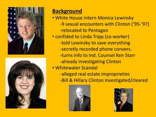 The Clinton/Lewinsky impeachment scandal involved a sexual relationship between President Bill Clinton and White House intern Monica Lewinsky from 1995 to 1997. Linda Tripp, a co-worker of Lewinsky's, secretly recorded phone conversations with Lewinsky about the affair and turned the information over to Independent Counsel Ken Starr, who was already investigating Clinton. In 1998, Clinton denied having "sexual relations" with Lewinsky but later admitted to an "inappropriate relationship." He was impeached by the House for perjury and obstruction of justice but acquitted by the Senate. The scandal increased polarization between political parties.