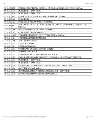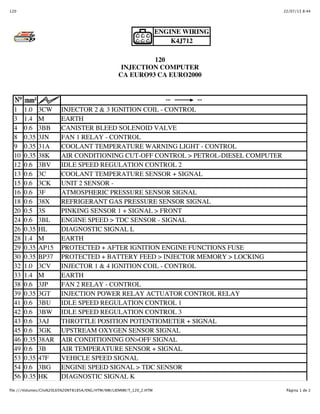 This document provides a wiring diagram for an engine injection computer. It lists 120 electrical components connected to the computer, including injectors, ignition coils, sensors for coolant temperature, air pressure, engine speed, and more. The components are numbered and their wiring thickness and function are described. This computer controls components related to fuel injection, emissions control, and other engine functions.