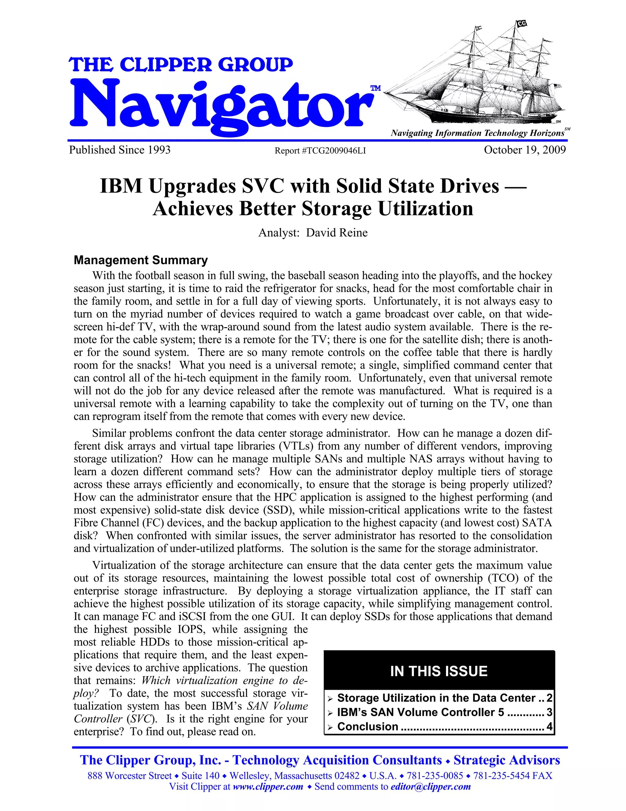 IBM's SAN Volume Controller (SVC) 5 introduces solid-state drive (SSD) support to enhance storage utilization and simplify management for data centers. The SVC allows integration of multiple storage types, improving flexibility and reducing total cost of ownership (TCO) by up to 30%. It provides high performance with capabilities like 800,000 read IOPS and multiple cluster mirrors for disaster recovery, making it an attractive solution for enterprises seeking to optimize their storage architecture.