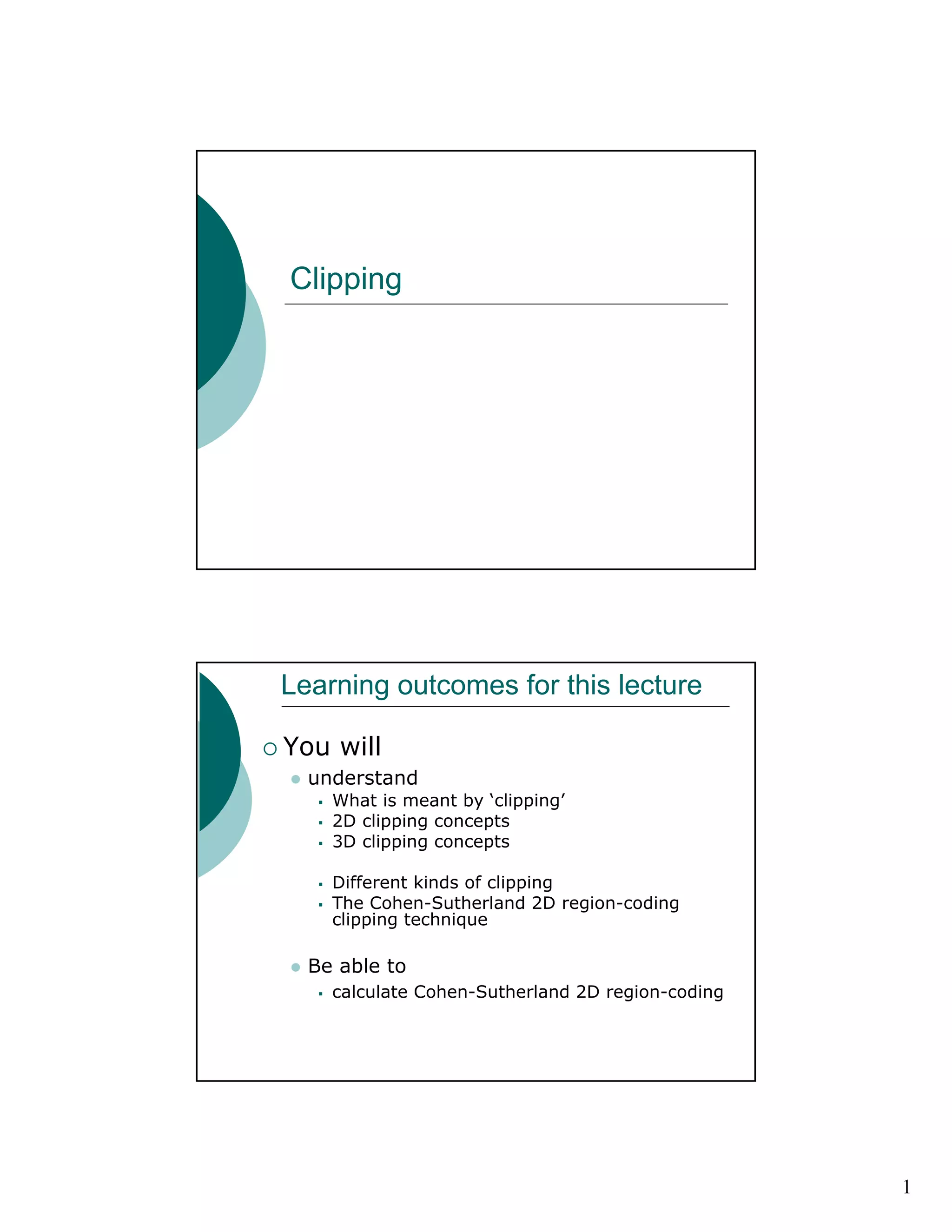 The document discusses different concepts related to clipping in computer graphics including 2D and 3D clipping. It describes how clipping is used to eliminate portions of objects that fall outside the viewing frustum or clip window. Various clipping techniques are covered such as point clipping, line clipping, polygon clipping, and the Cohen-Sutherland algorithm for 2D region clipping. The key purposes of clipping are to avoid drawing objects that are not visible, improve efficiency by culling invisible geometry, and prevent degenerate cases.