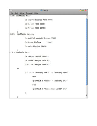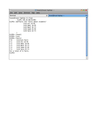 This document serves as a basic student guide for learning the CLIPS expert system and its integration with various programming languages like C, C++, and Python. It includes programming examples, essential commands, and explanations of fundamental concepts such as knowledge representation and rules within CLIPS. The guide aims to assist students, particularly in non-engineering disciplines, to understand the basics of expert systems and practical coding in CLIPS.