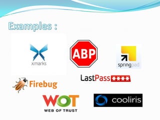 Browser extensions are programs that add new functionality to browsers. They are developed using technologies like HTML, CSS, JavaScript, and XML. The general structure of an extension includes metadata, a user interface, and functionality. Chrome extensions have a manifest file and folder structure that includes optional files. Firefox extensions have an install manifest file and chrome folder structure that can include XUL, JavaScript, images and more. Extensions are loaded by clicking "Load unpacked extension" in the browser extensions page after placing the extension files in a folder.