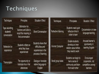 The document summarizes the Community Language Learning (CLL) method for teaching language. CLL uses counseling-learning theory and aims to create a non-threatening learning environment by having teachers take on the role of language counselors. It allows students to learn at their own pace and express themselves in their native language when discussing feelings about the learning process. The goal is for students to learn communicatively by interacting with each other and taking increased responsibility for their language learning.