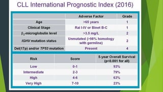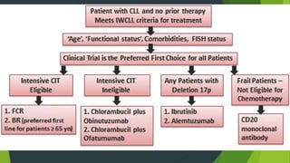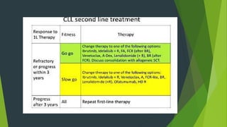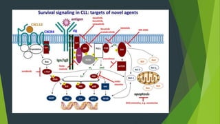 Chronic lymphocytic leukemia (CLL) is derived from CD5+ B cells and is driven by genetic lesions and interactions with the microenvironment. CLL cells have abnormalities in apoptosis pathways like high Bcl-2 and FLIP expression that make them resistant to death signals. They also show chronic B-cell receptor signaling from tonic or antigen stimulation. The microenvironment protects CLL cells through cytokines and cell-cell contact with nurse-like cells and stromal cells. CLL cells harbor genetic changes like 13q14 deletions, trisomy 12, and mutations in NOTCH1 and SF3B1 that contribute to pathogenesis. Antigen stimulation may select for the restricted immunoglobulin repertoire in C