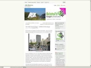 The document discusses the implementation of e-democracy in Bristol, aiming to improve citizen involvement in local decision-making through various online tools such as e-petitions, social media, and webcasting. Since 2004, the city has seen significant citizen engagement, exemplified by the stadium petition garnering over 90,000 signatures. The document highlights future developments in hyper-local community websites and the importance of social media for broader participation.