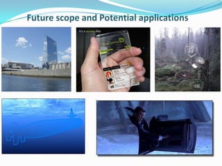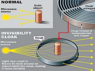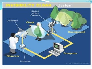 This document discusses invisibility cloaking technology. It defines cloaking as making visible things invisible using either metamaterials or an invisibility cloak system. There are two types of invisibility cloaking: 1) Using metamaterials to control light reflection properties to make objects invisible, and 2) An invisibility cloak system using a video camera, computer processor, and image projector to project background images to visually replace invisible stationary objects. Potential applications include cloaking military vehicles, making buildings invisible, and improving wireless signals by allowing waves to flow around objects.