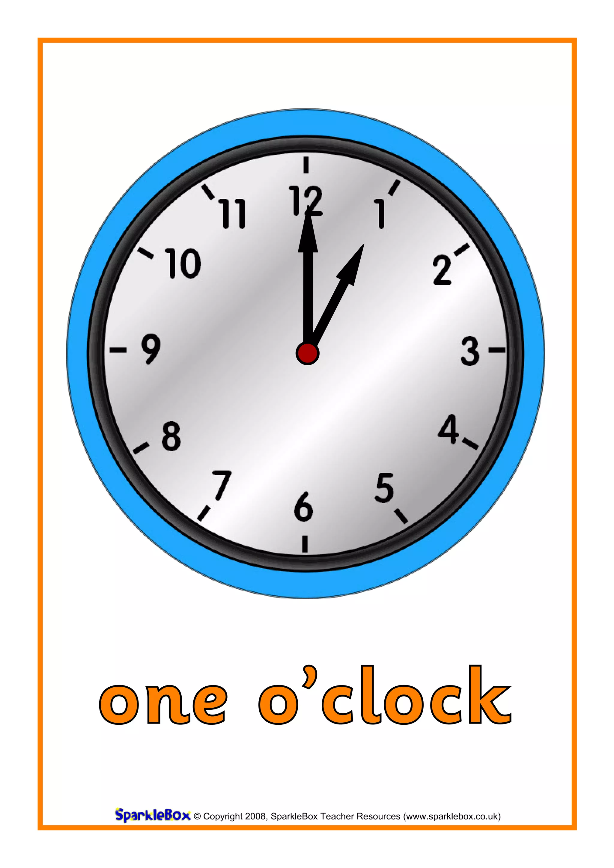 The document lists the hours of the day from one o'clock to twelve o'clock, with each hour followed by a copyright notice attributing the content to SparkleBox Teacher Resources and the year 2008.