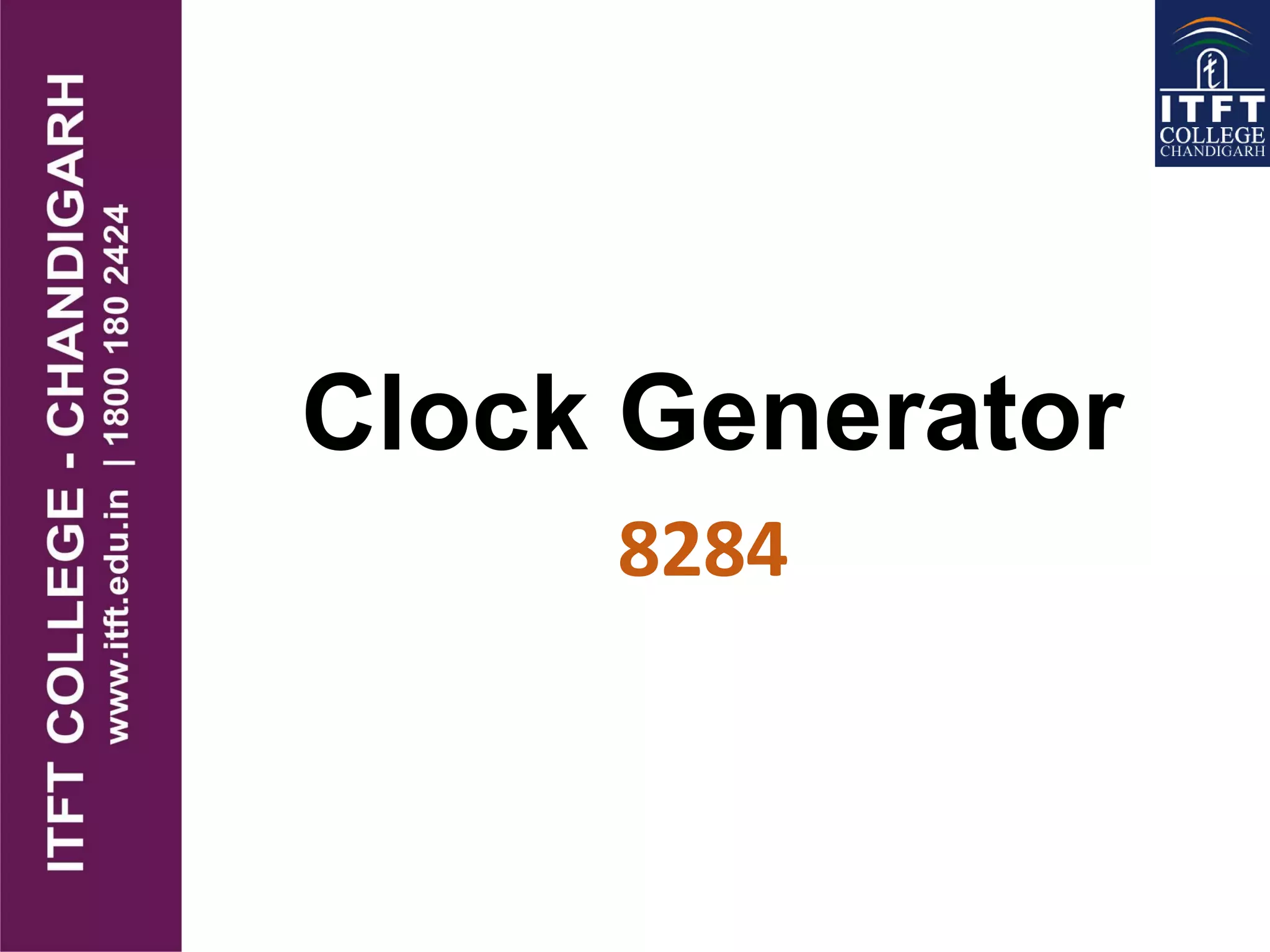 The 8284 is an integrated circuit clock generator designed specifically for use with the 8086/8088 microprocessors. It provides clock signals and synchronization that are required by these processors. The 8284 contains oscillators that generate the clock signal from either an internal or external crystal. It also contains circuitry to synchronize ready signals and generate wait states. Pins on the device include clock outputs, ready inputs, and a reset output to interface with the microprocessor.
