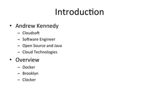 Clocker is a platform that combines Brooklyn and Docker to manage Docker containers as microservices. It addresses limitations of Docker like networking across multiple hosts. Clocker uses application blueprints and orchestration policies to deploy containers. The roadmap includes improving placement strategies, integrating with other container platforms, and enhancing networking and communication between containers on different hosts.