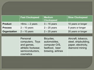 This document discusses how clockspeed, or the rate of change, varies across industries based on the speed of process, product, and organizational changes. It provides examples of how distribution channels, brands, and supply chains have evolved at different paces in different industries. Faster clockspeed industries like MICE (meetings, incentives, conferences, exhibitions) require more agile strategies like hedging and collaboration between competitors. Technology innovation and competition are key drivers of increasing clockspeed, making sustainable advantages more temporary.