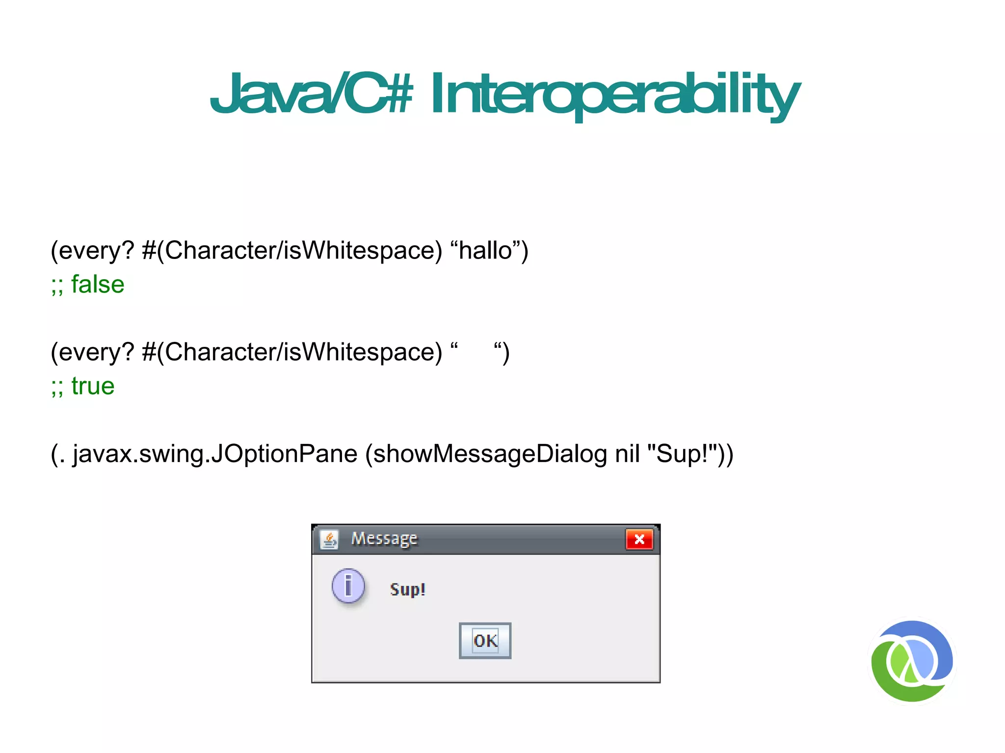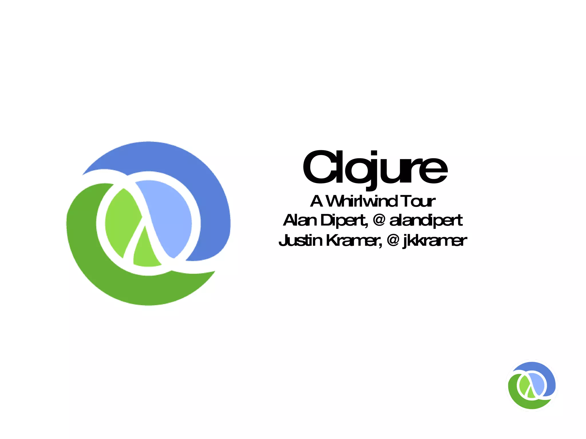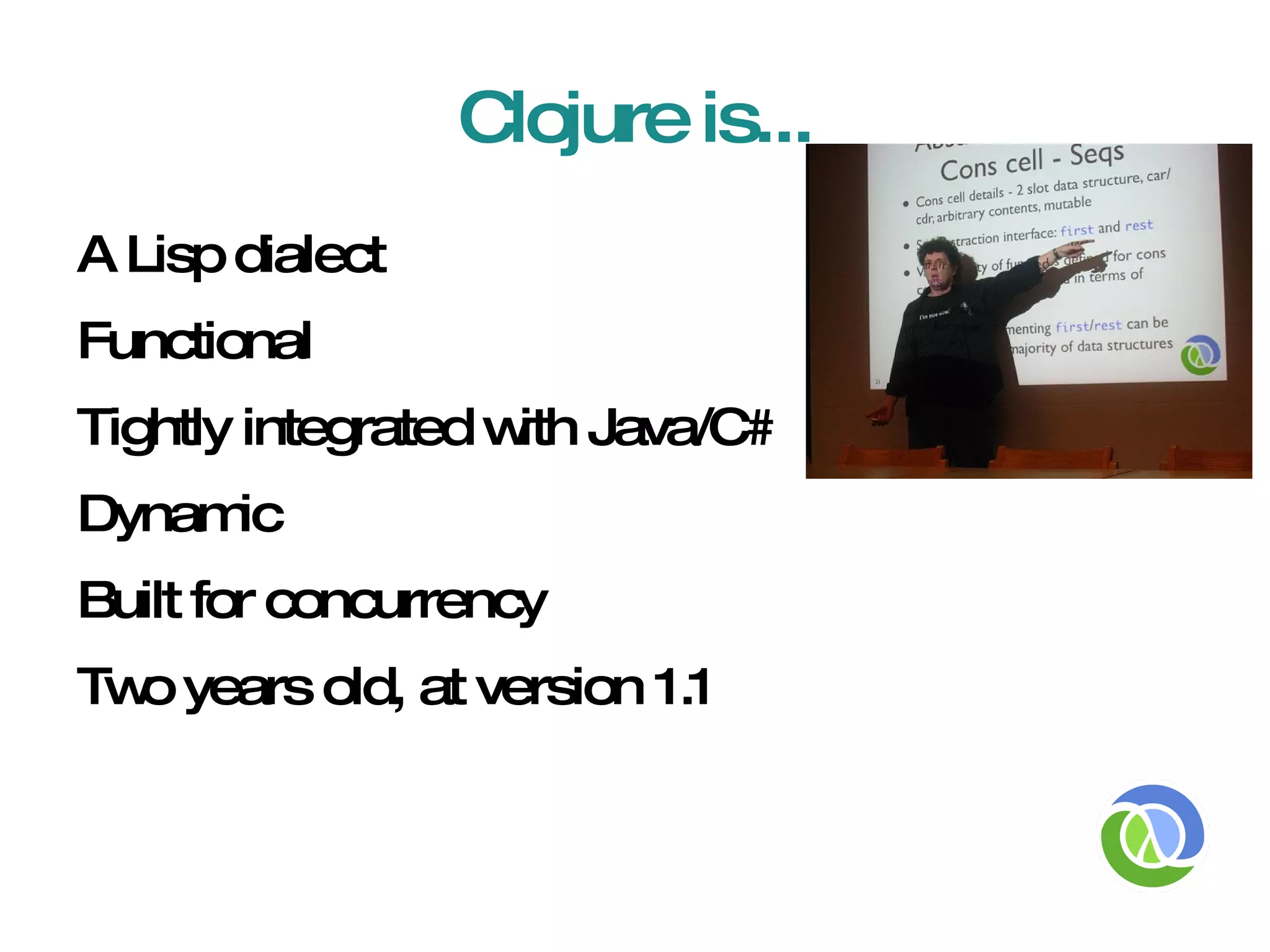Clojure is a functional programming language that runs on the JVM and CLR, emphasizing immutability and concurrency with a lisp syntax. It supports interoperability with Java and C#, allowing easy interaction with external libraries and objects, all while maintaining a dynamic and flexible code structure. Key features include higher-order functions, persistent data structures, and a focus on minimizing mutable state to enhance concurrency and reduce bugs.