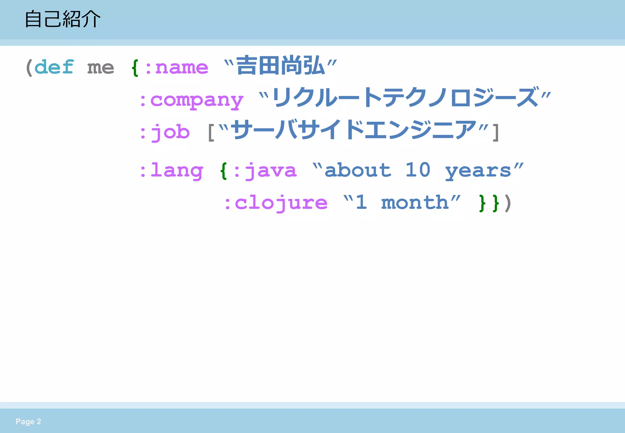 (def me {:name “吉田尚弘” :company “リクルートテクノロジーズ” :job [“サーバサイドエンジニア”] :lang {:java “about 10 years” :clojure “1 month” }})