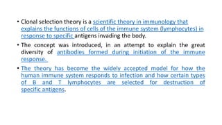 Clonal selection theory is an immunological model explaining the diversity of antibody production in response to specific antigens. It describes how pre-existing lymphocytes, particularly B cells, are activated by antigens, resulting in proliferation and production of clones for antibody production in secondary lymphoid organs. The theory outlines four key tenets, including unique receptor specificity for lymphocytes and the destruction of lymphocytes that bind to self-antigens.