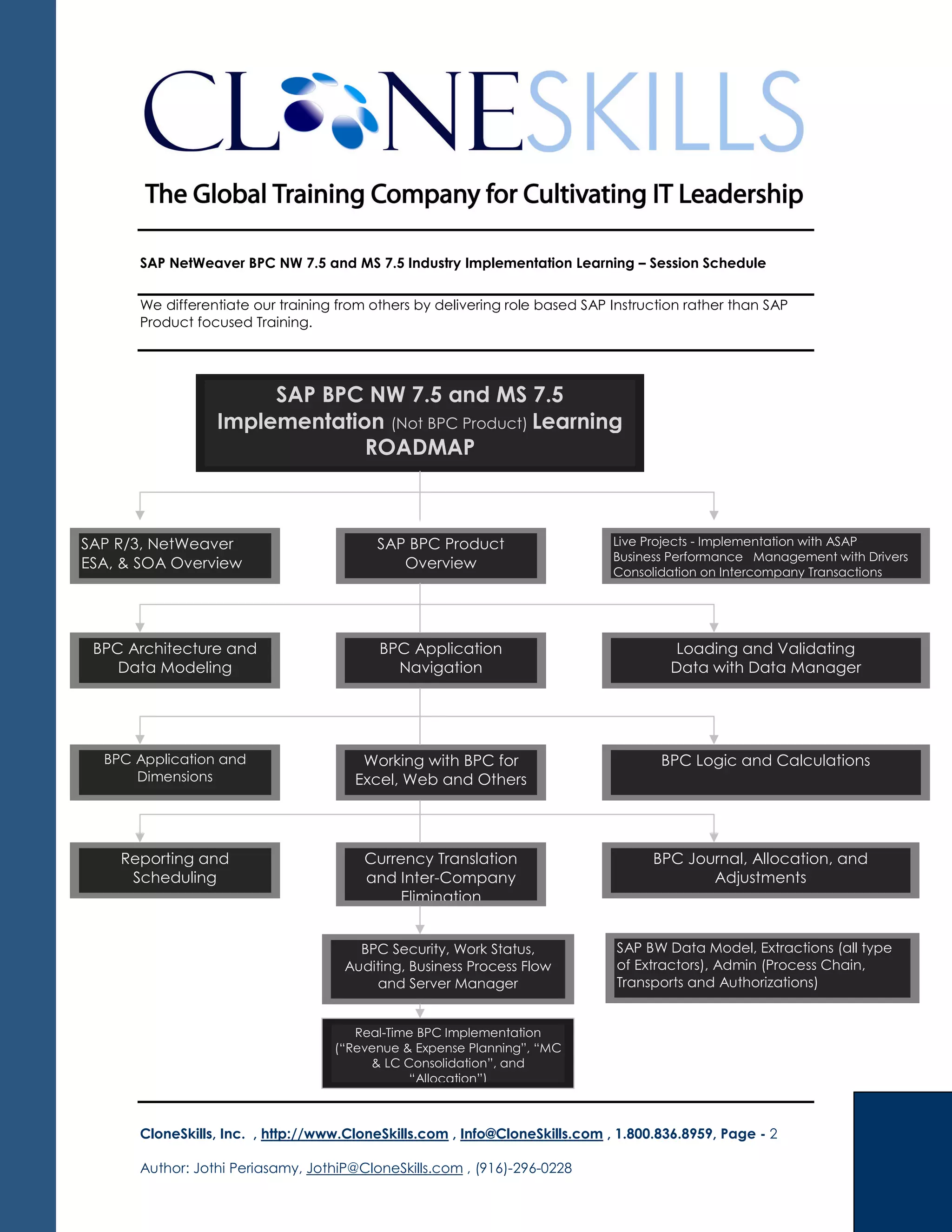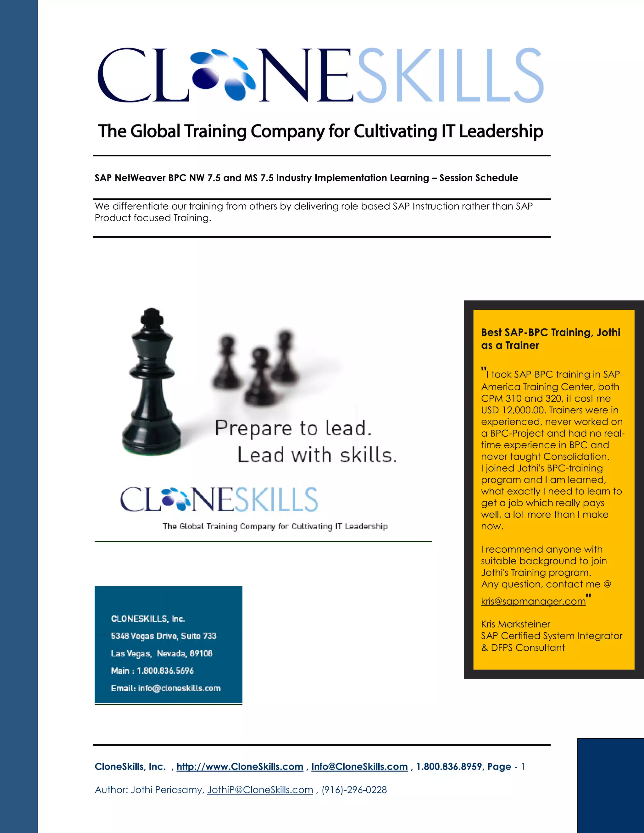 The document outlines a training program for SAP NetWeaver BPC NW 7.5, emphasizing a role-based instructional approach over traditional product-focused training. It includes a detailed session schedule, topics covered, and testimonials from past participants highlighting the program's focus on practical skills for job placement in SAP BPC roles. Contact information for the training provider, Cloneskills, Inc., is also provided.