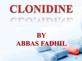 Clonidine is an alpha-2 adrenergic receptor agonist used to treat hypertension. It works by stimulating alpha-2 receptors in the brain to inhibit the release of norepinephrine, reducing peripheral vascular resistance and lowering blood pressure. Common side effects include dizziness, dry mouth, and sedation. Clonidine can also be used to treat migraines, menopausal hot flashes, and opioid withdrawal symptoms. It has drug interactions with aspirin, atenolol, and clomipramine that can increase side effects or toxicity. Clonidine is pregnancy category C and may harm the fetus or pass into breastmilk.