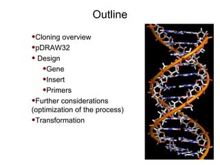 This document provides an overview of the cloning process and considerations for designing cloning experiments. It discusses four main steps: insert synthesis, restriction enzyme digestion, ligation, and transformation. Key aspects covered include gene and insert design using software like pDRAW32, choosing appropriate restriction sites and enzymes, primer design for insert synthesis, and vector and bacterial strain selection. The goal is to provide all the important information needed in one place to successfully clone a gene of interest.