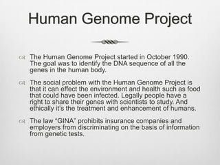 This document discusses cloning extinct species by taking DNA samples and transferring them to closely related living species. It provides two key arguments for cloning extinct animals. The first is that cloning could help prevent endangered species from going extinct by enabling reproduction. The second is that cloning extinct animals would allow scientists to directly study and observe what these ancient species looked like and how they behaved. Cloning could potentially lead to reintroducing certain cloned species to the wild if their populations grow and show good behavior.