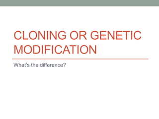 Cloning involves creating an exact genetic copy of an organism, with all of its DNA being identical. Genetic modification involves altering the genes of an organism using biotechnology, usually targeting one or a few specific genes to change a trait. While cloning aims to replicate an organism entirely, genetic modification allows targeted changes to traits through gene addition or replacement. The document discusses how scientists in Jurassic Park cloned dinosaurs using ancient DNA preserved in amber, but had to use frog DNA to fill in missing segments, showing how cloning and genetic modification techniques can be combined.
