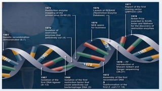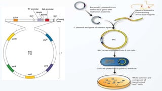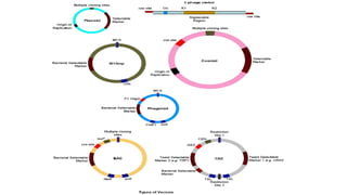 This document discusses cloning vectors, which are DNA molecules used to transport cloned DNA sequences between biological hosts. It defines a cloning vector as a small piece of DNA from a virus, plasmid, or cell that can maintain foreign DNA for cloning. The summary describes the key features of cloning vectors, including an origin of replication, cloning site, selectable marker, and optional reporter gene. It also lists common vector types like plasmids, bacteriophages, cosmids, and artificial chromosomes, and factors that determine the choice of vector, such as insert size.