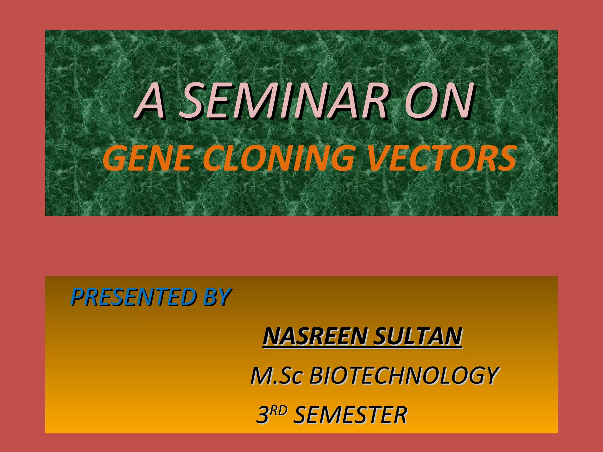 The document discusses different types of gene cloning vectors including plasmids, bacteriophages, cosmids, and phagemids. Plasmid vectors like pBR322 contain selectable markers and a multiple cloning site. Bacteriophage vectors like lambda phage infect bacteria and can carry larger DNA inserts. Cosmid vectors combine properties of plasmids and phages to clone fragments up to 50kb. All of these vector types allow cloning and replication of foreign DNA fragments in host cells.