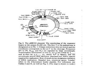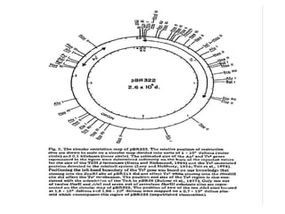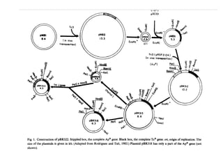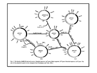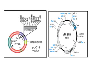 This document discusses gene cloning and various cloning vectors. It provides details about plasmid vectors such as pBR322 and pUC18/19. pBR322 was one of the first widely used E. coli cloning vectors, containing genes for ampicillin and tetracycline resistance. It served as a model for prokaryotic transcription and replication studies. The document discusses the structure, properties, replication and uses of pBR322. It also describes the expression vector pUC18/19, which is derived from pBR322 and contains a multiple cloning site for inserting genes between the beta-lactamase gene and a fragment of the lacZ gene.