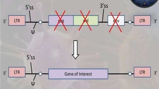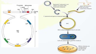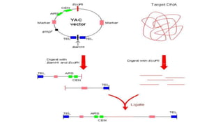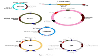 A cloning vector is a small piece of DNA, such as a plasmid, virus, or artificial chromosome, that can accept foreign DNA and be replicated within a host cell. The summary describes the main types of cloning vectors, including plasmids, bacteriophages, cosmids, BACs, YACs, and retroviral vectors. It also outlines some key features of cloning vectors like origins of replication, cloning sites, and selectable markers. The choice of vector depends on factors like the size of the DNA insert and cloning efficiency.