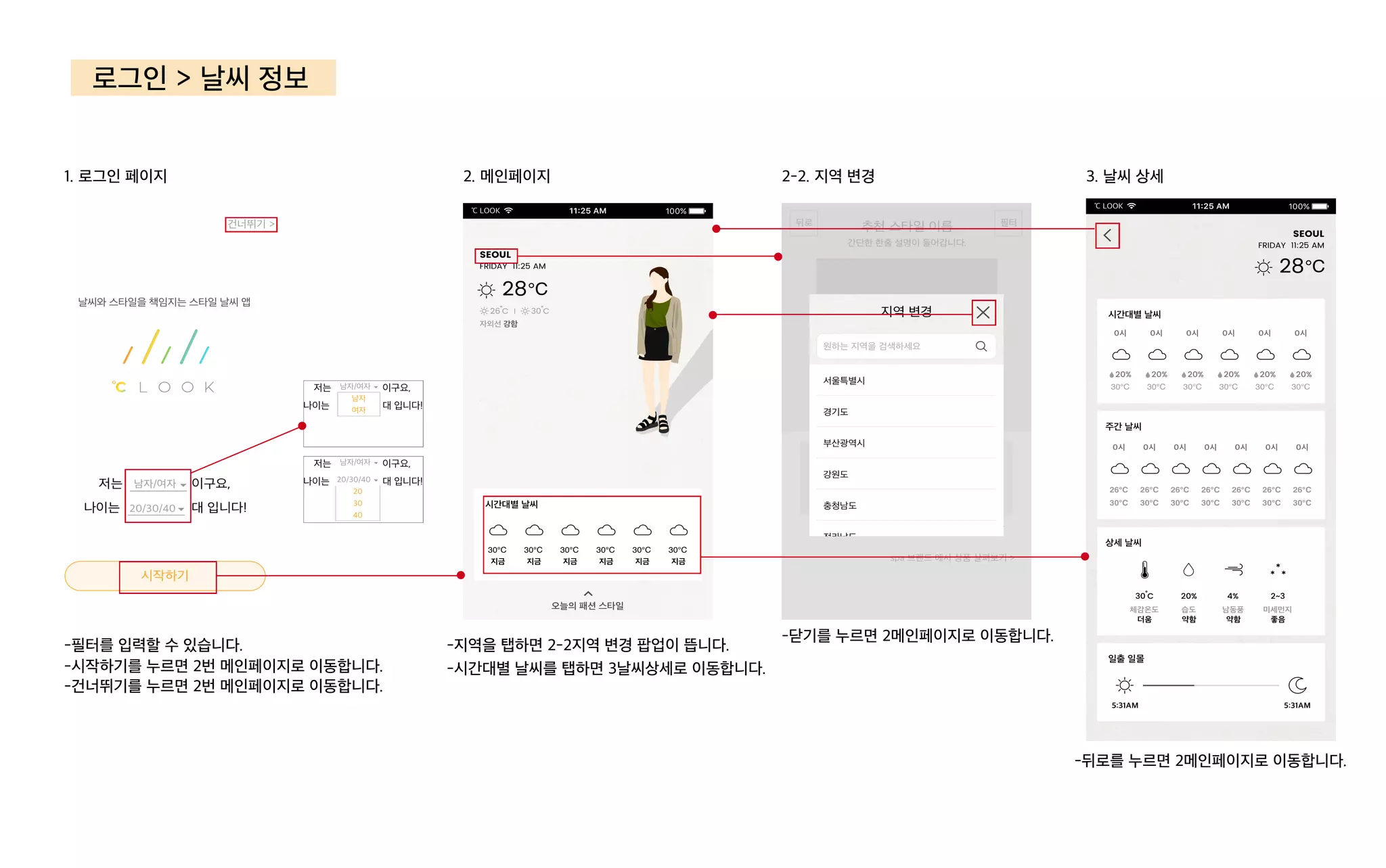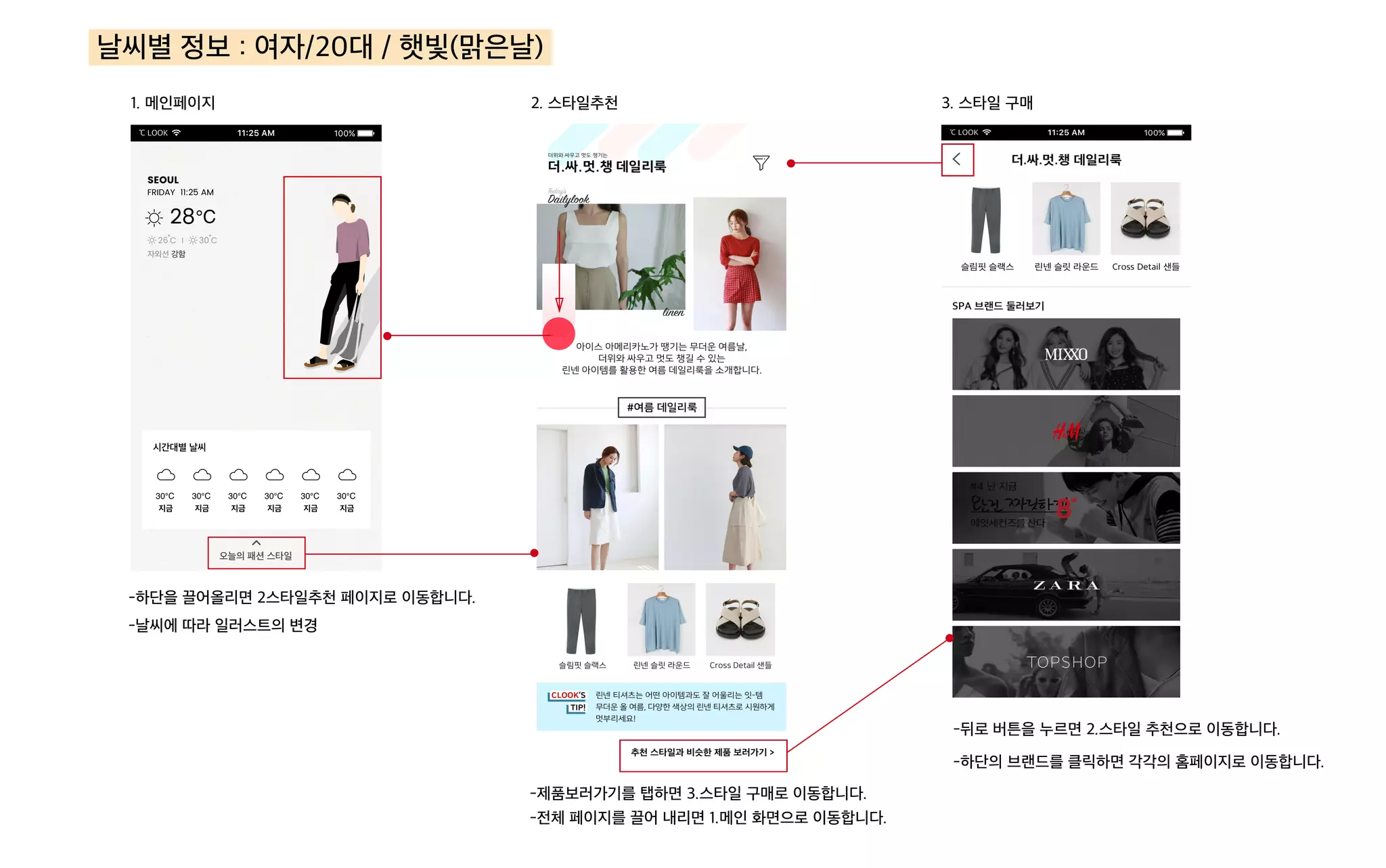 1. 메인페이지 2.스타일추천 3. 스타일 구매 -하단을 끌어올리면 2스타일추천 페이지로 이동합니다. -제품보러가기를 탭하면 3.스타일 구매로 이동합니다. -전체 페이지를 끌어 내리면 1.메인 화면으로 이동합니다. -뒤로 버튼을 누르면 2.스타일 추천으로 이동합니다. -하단의 브랜드를 클릭하면 각각의 홈페이지로 이동합니다. 날씨별 정보 : 여자/20대 / 비 (흐린날) -날씨에 따라 일러스트의 변경