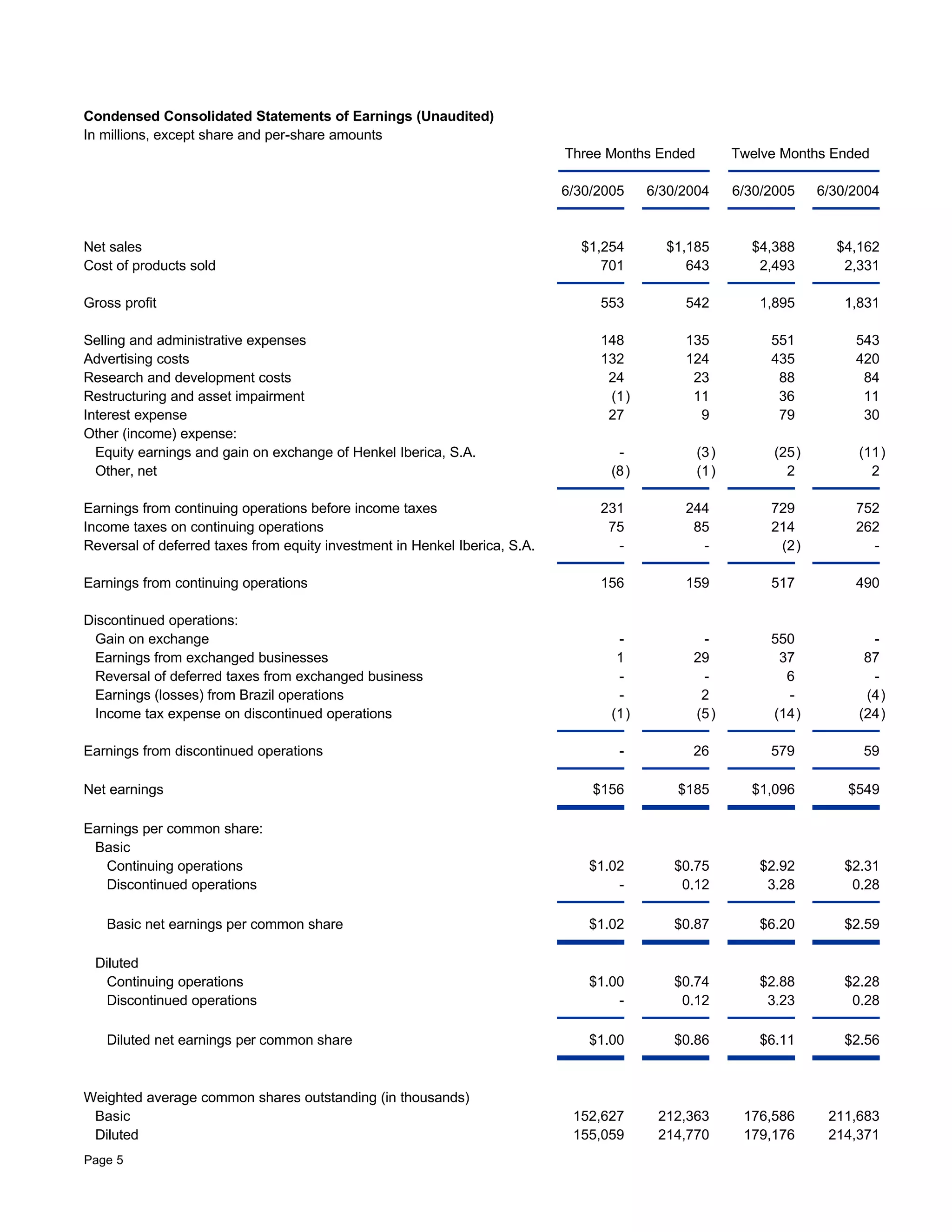 This document summarizes the financial performance of a company for the third quarter and fiscal year ending June 30, 2005 compared to the prior year. It shows that net sales increased 6% for the quarter and 5% for the year. Earnings from continuing operations were $156 million for the quarter and $517 million for the year. The company also had significant earnings from discontinued operations of $579 million for the year from the sale of a business unit.
