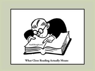 This document provides an agenda for a training session on how to implement close reading strategies. It will cover why close reading is important, how to model close reading, how to write text-dependent questions, and providing examples for different content areas. Attendees will learn that close reading involves carefully re-reading short texts with a specific purpose in mind. It helps students engage with and understand what texts explicitly say as well as make inferences. The training will provide guidance on selecting appropriate texts and crafting text-dependent questions to facilitate close analysis of key passages.
